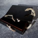 | Ausführungen | Drachen versilbert, Einlegearbeit mit zerstossenen schwarzen Muschelschalen, Handarbeit |