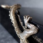 Handarbeit | Einlegearbeit mit zerstossenen schwarzen Muschelschalen | Drachen versilbert