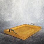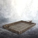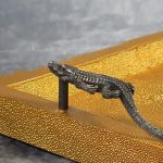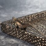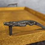 | Ausführungen | Handarbeit, Papageienfisch-Haut Tablett mit bronze patinierten Leguan-Griffen, Stachelrochen Tablett mit bronze patinierten Krokodil-Griffen |